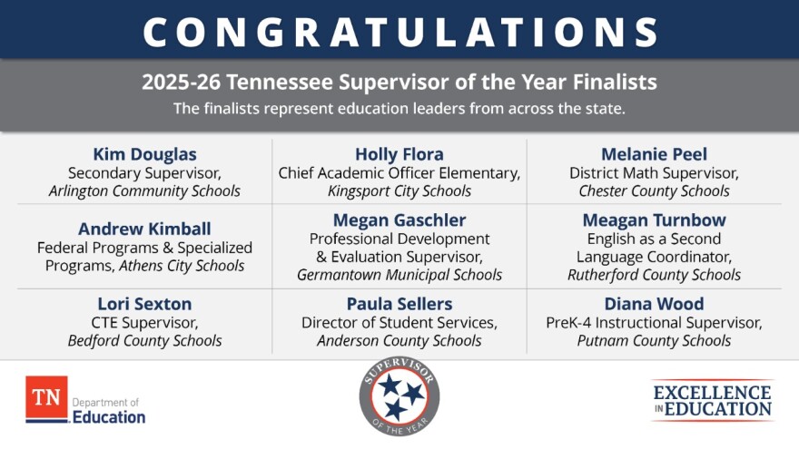 The Tennessee Department of Education (TDOE) has announced the finalists for the 2025–26 Tennessee Principal of the Year and Supervisor of the Year awards, recognizing outstanding education leaders from across the state. The finalists represent each of Tennessee’s Grand Divisions: West, Middle, and East.